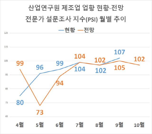 산업연구원은 이달 8~12일 전문가 122명에게 월별 업황 현황을 물은 결과, 9월 업황 현황 전문가 설문조사지수(PSI)가 107로 전월(102)대비 5포인트 상승했다고 21일 밝혔다. 절대적인 수치도 지난해 7월(113) 이후 14개월 만에 가장 높았다.