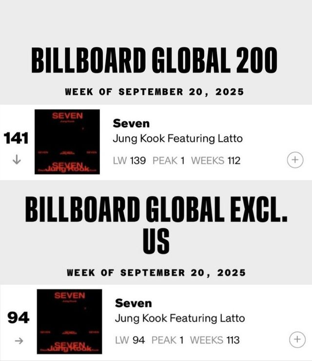 ‘Seven’은 같은 날 발표된 ‘글로벌(미국 제외)’ 차트에서도 94위를 차지하며 무려 113주 연속 랭크에 성공했다. 두 차트를 동시에 뚫고 최장 진입 기록을 이어가는 아시아 솔로는 정국이 유일하다.