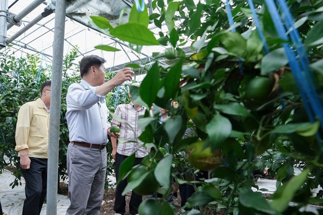 지난 19일 오영훈 지시가 레드향 열과 피해 상황을 확인하기 위해 서귀포시 남원읍 레드향 농가를 찾았다. 제주도 제공