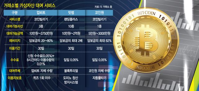 대여금액 한도는 업비트가 최대 3750만원(기존 5000만원에서 축소), 코인원이 3000만원, 빗썸은 2억원(기존 10억원에서 축소)이다. 레버리지 수준은 업비트가 담보금의 20~80%, 빗썸이 최대 2배, 코인원이 최대 82%로 차이를 보인다.