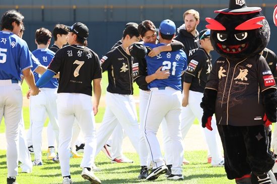 한때 삼성에서 한솥밥을 먹었던 김상수와 우규민이 KT 선수단을 대표해 선물을 전달했다. KT는 오승환을 상징하는 돌직구가 박힌 수원화성 팔달산 채석장 피규어를 기념 선물로 전달했다. 삼성도 KT 구단에 오승환의 사인 글러브와 명패를 선물했다.