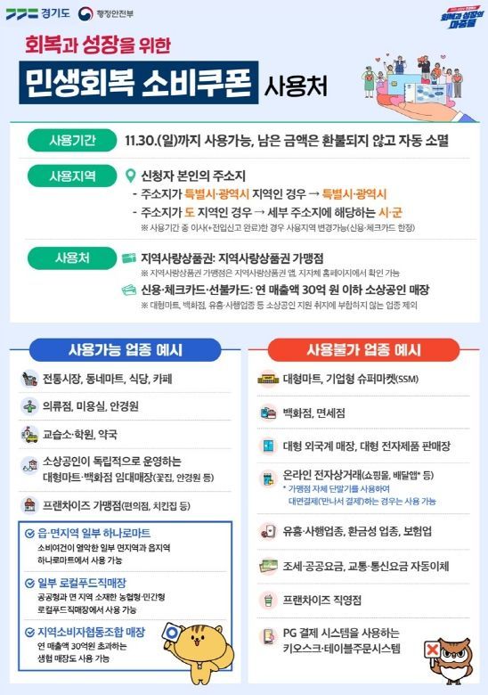 사용처의 경우 1차 때와 같이 30억 원 이하 소상공인 업종으로 제한되지만 소비 여건이 열악한 일부 읍면 지역 하나로마트, 공공형 또는 면 지역에 소재한 로컬푸드직매장, 법인 소재지와 매장 소재지가 일치하는 지역생협매장은 매출액과 무관하게 사용 가능하도록 했다. 예외적으로 사용가능한 매장은 행정안전부 누리집(홈페이지)에서 확인할 수 있다.
