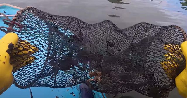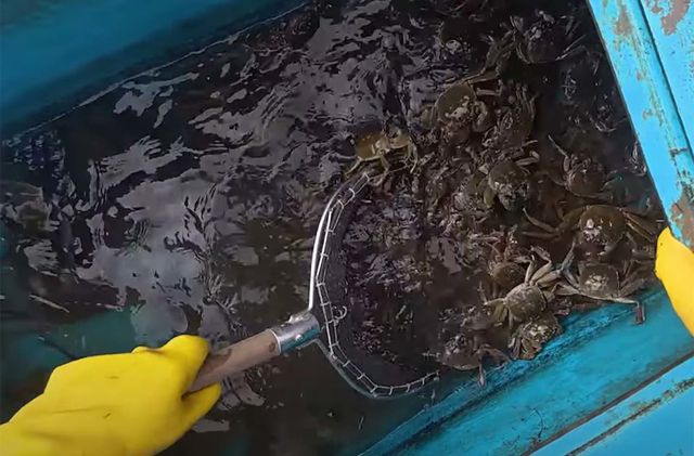 돼지고기를 넣은 통발을 던진 다음날 통발을 확인하러 나선 청년어부는 첫 번째 통발에서부터 큼지막한 크기의 참게를 잡았다.