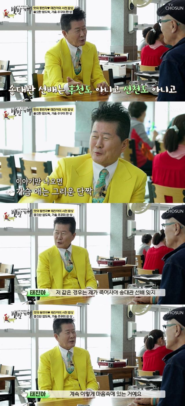 이에 허영만이 "故 송대관 선생도 후천적이냐"라고 묻자 태진아는 "송대관 선배는 선천도, 후천도 아니고 중간이다"라고 밝혀 웃음을 자아냈다. 송대관의 이름이 언급되자, 태진아는 "송대관 선배 얘기만 나오면 보고 싶다"라고 말하며 그리운 마음을 드러냈다.