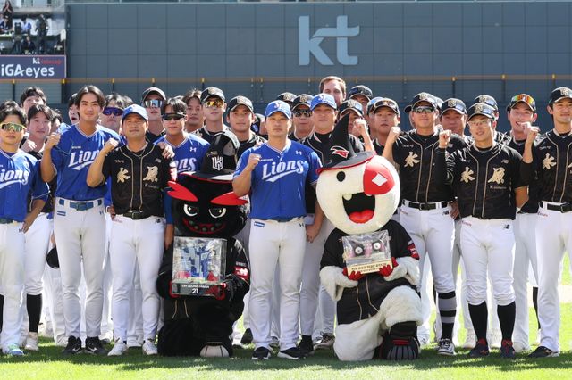 이어진 기념 사진 시간, 삼성과 KT 선수들이 모두 마운드 부근으로 모인 가운데, '전 삼성맨' 김상수와 우규민은 삼성 선수단이 건넨 삼성 모자를 쓰고 기념사진을 찍었다.