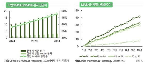 한용희 그로쓰리서치 연구원은 "레즈디프라 출시 이후 MASH 치료제 시장의 가능성이 실질적으로 입증됐다"며 "특히 다양한 병기와 병인 특성을 가진 환자군을 겨냥해 다양한 작용기전의 치료제들이 병존할 수밖에 없다"고 설명했다.