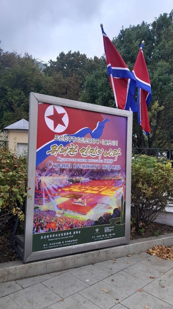 박물관 정문 양쪽에는 북한과 러시아 국기가 걸린 전시회 포스터가 각각 걸려 있었다.
