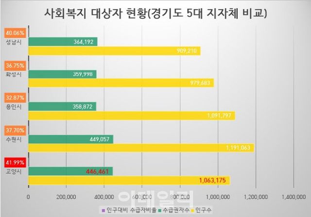 인구 대비 수급자 비율 역시 고양시는 41.99%로 도내에서 규모가 비슷한 성남(40.06%)과 화성(36.75%), 용인(32.87%), 수원(37.70%)에 비해 가장 높다.
