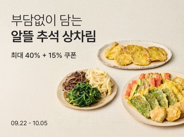 명절 모둠 나물과 모둠 전, 잡채 등을 한 번에 준비하길 원한다면 배송 희망일을 지정할 수 있는 ‘상차림 세트’가 제격이다. 전국 각지의 신선한 재료로 반찬을 만드는 동구나무 명절한정 상차림 세트를 비롯해 진가네반찬 명절 상차림 세트, 도리깨침 명절한정 프리미엄 상차림 세트 등을 선보인다. 명절 당일 이틀전부터 샛별배송으로 받을 수 있고, 추석 얼리버드 쿠폰을 활용하면 추가 할인도 가능하다.