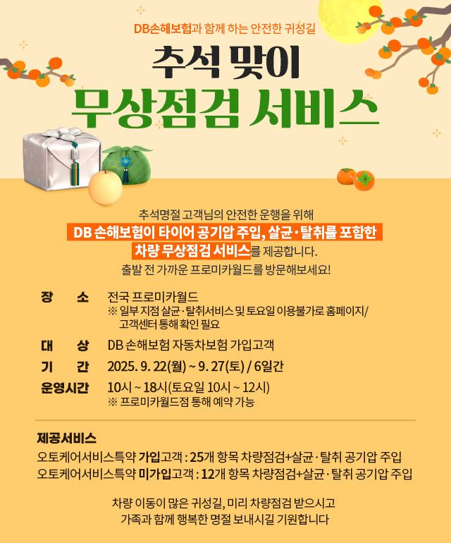 DB손해보험은(005830) 2025년 추석명절을 대비해 고객의 안전한 운행을 지원하고 사고 예방 활동을 강화하고자 오는 27일까지 차량 무상점검 서비스를 실시한다고 22일 밝혔다.