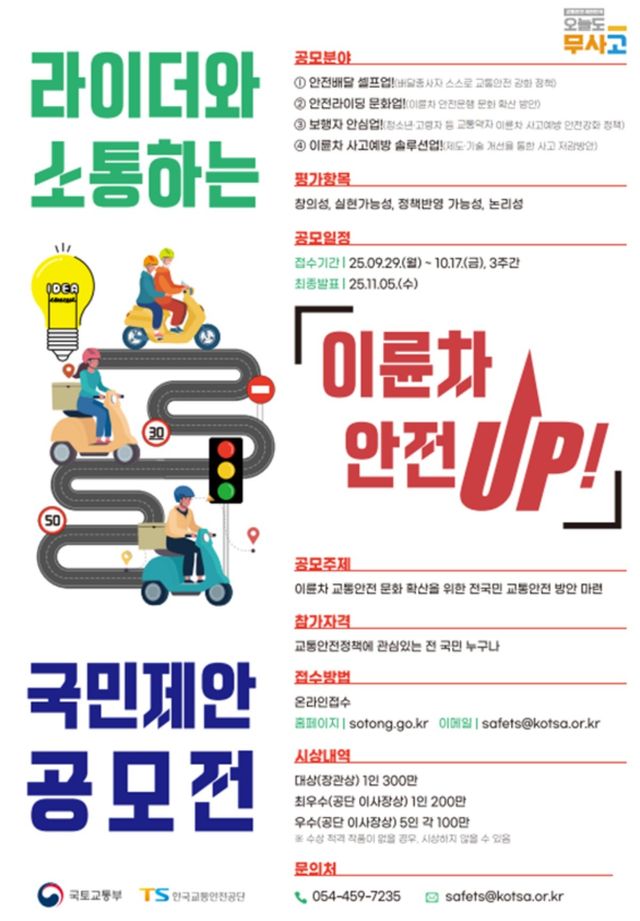 공모전에는 교통안전정책에 관심 있는 국민이라면 누구나 참여할 수 있다. 이륜차 안전 문제를 직접 경험했거나 개선이 필요하다고 느낀 점, 사고를 줄일 수 있는 제도적 아이디어, 혹은 안전 문화 확산을 위한 방안까지 자유롭게 제안하면 된다. 문제 인식과 개선방안, 기대효과를 담아 제출하는 방식으로 제한은 없다.