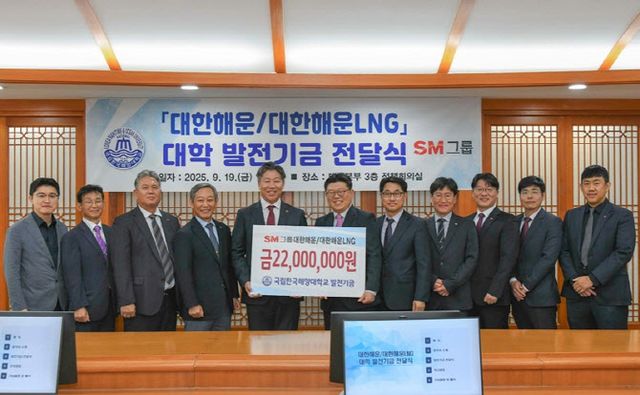 대한해운은 지난 19일 부산 영도구 한국해양대에서 발전기금 기탁식을 열었다. 이날 기탁식에는 한국해양대 류동근 총장, SM그룹을 대표해 KLCSM 권오길 대표이사, 대한해운 김명익 WET BULK선 사업실장 등 회사와 대학 관계자 30여명이 참석해 뜻을 함께했다. 이번 발전기금 전달은 SM그룹 우오현 회장이 역점을 두고 추진 중인 ESG(환경·사회·지배구조) 경영의 일환으로 이뤄졌다.