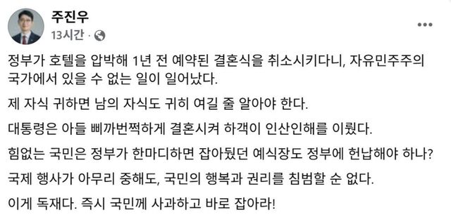 주 의원은 지난 21일 자신의 SNS에 글을 올려 “정부가 호텔을 압박해 1년 전 예약된 결혼식을 취소시키다니 자유민주주의 국가에서는 있을 수 없는 일”이라고 지적했다.