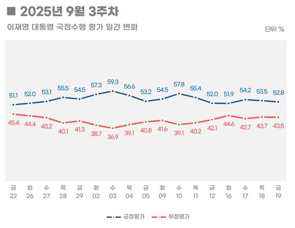 일간으로는 지난 금요일(12일) 52.0%(부정 평가 42.1%)로 마감한 후, 16일(화)에는 51.9%(0.1%P↓, 부정 평가44.6%)로 하락세를 보였지만, 주 중반 17일(수)에는 54.2%(2.3%P↑, 부정 평가 42.7%)로 반등했고, 18일(목)에는 53.5%(0.7%P↓, 부정 평가 43.7%), 19일(금)에는 52.8%(0.7%P↓, 부정 평가 43.5%)로 다시 하락하며 마감했다.
