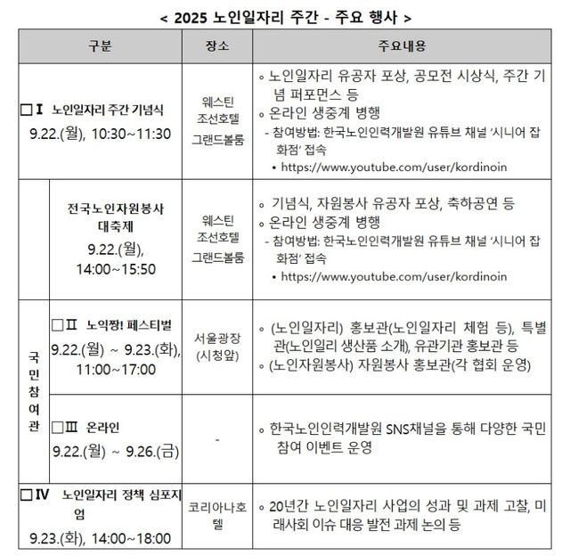 올해 행사는 ▲우수 수행기관·유공기관 시상 ▲전국노인자원봉사대축제 ▲노인일자리 정책 심포지엄 ▲국민참여관 운영 등으로 꾸려진다. 오프라인 현장 행사와 온라인 참여 프로그램을 병행한다.