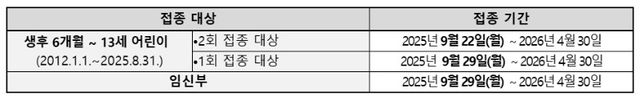 이번 예방접종은 대상자별로 순차적으로 진행된다. 생후 6개월~9세 어린이 중 생애 첫 접종자 또는 기존에 1회만 접종한 어린이(2회 접종 대상)는 22일부터 접종을 받을 수 있다. 이어 9월 29일부터는 1회 접종 대상 어린이(만 13세 이하)와 임신부에 대한 접종이 시작된다.