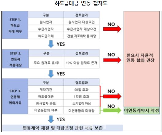 하도급대금 연동제는 주요 원재료 가격이 일정 수준 비율 이상 변동하는 경우 그 변동분에 대해 하도급대금을 조정하는 제도다. 비율은 100분의 10 이내 범위에서 원사업자와 수급사업자가 협의해 정한다.