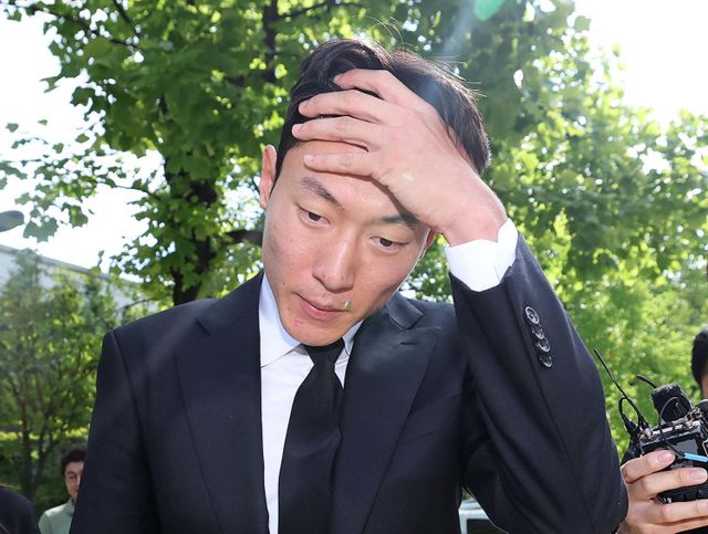 '불법 촬영' 혐의를 받는 축구선수 황의조(33·알라니아스포르)가 4일 오후 서울 서초구 서울중앙지방법원에서 열린 성폭력범죄의처벌등에관한특례법위반(카메라등이용촬영) 항소심 선고 공판에서 1심과 같은 징역 1년 집행유예 2년을 선고받은 후 법정을 나서며 심경을 밝히고 있다. / 뉴스1