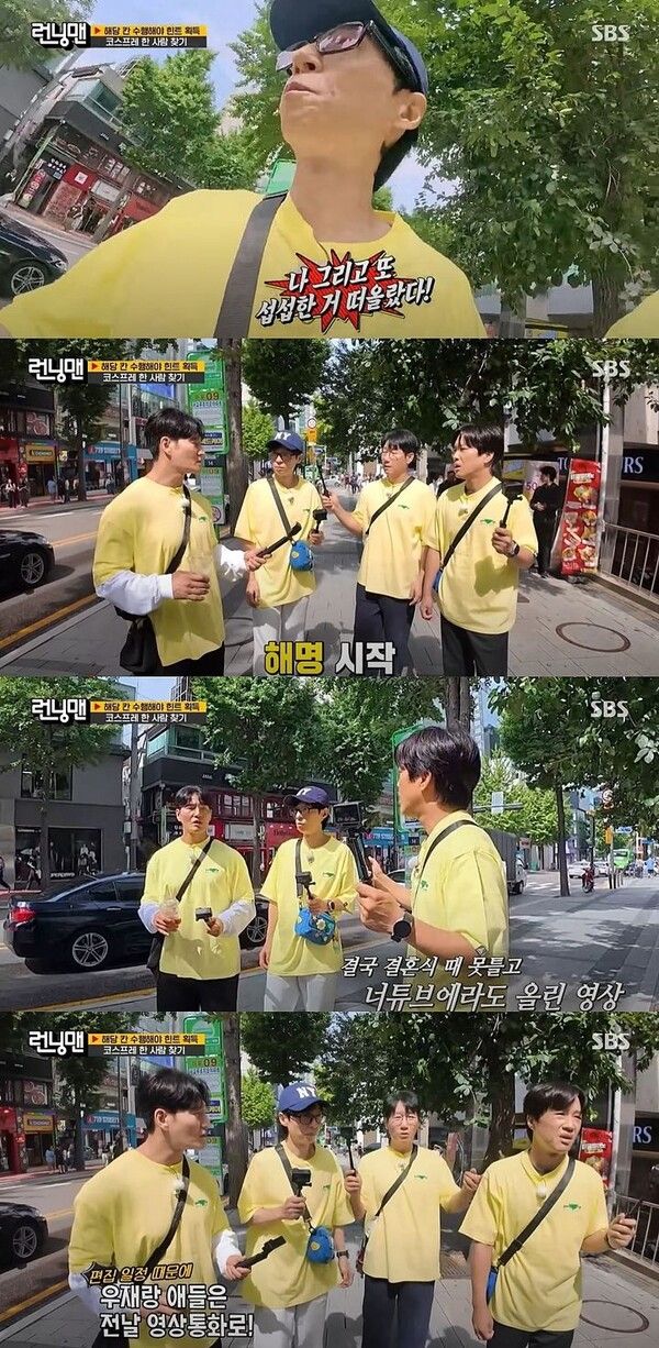 유재석은 미션을 위해 길을 가던 중 "나 섭섭한 거 떠올랐다"며 "너 왜 우리한텐 결혼식을 ('런닝맨' 촬영) 당일 알려주고, 주우재한텐 전날에 말해줬냐"고 말했다.