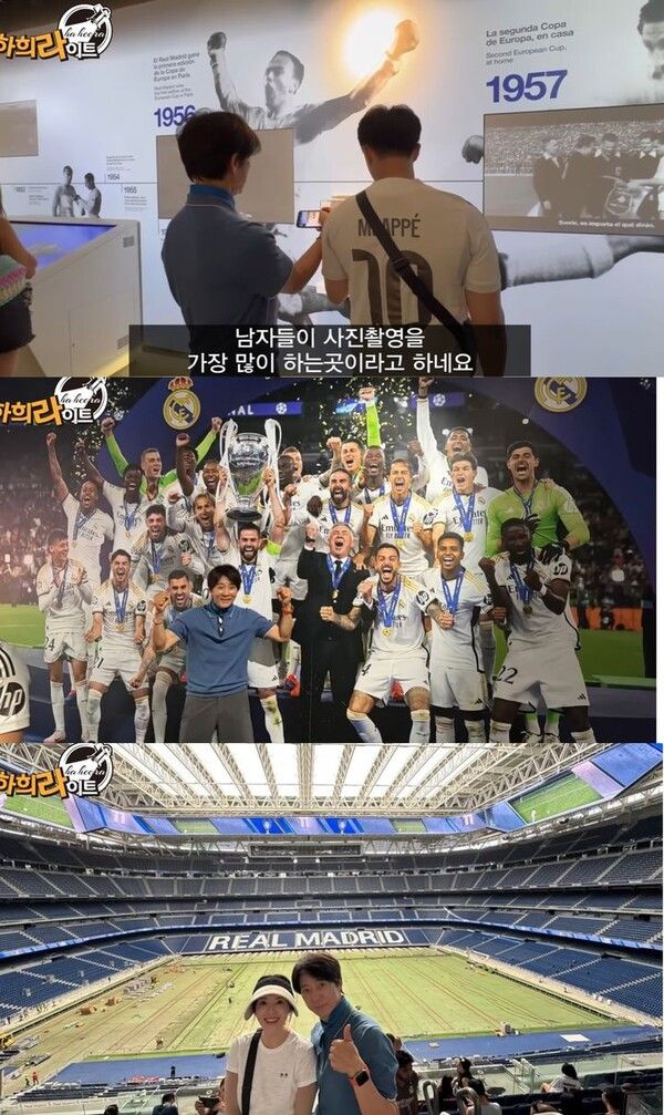 하희라는 "드디어 남편과 아들이 정말 오고 싶어했던 레알 마드리드 홈구장에 왔습니다"라며 산티아고 베르나베우 스타디움을 찾은 소감을 전했다.