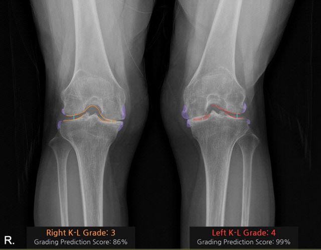 ‘코네보 코아(CONNEVO KOA)’는 무릎 X-ray 영상을 분석해 관절염 심각도를 ‘K-L(Kellgren-Lawrence) 등급’으로 판정하고, 골극과 관절 간격을 시각화해 제공한다. 이를 통해 진단의 일관성을 높이고 환자와 상담 시 유용한 시각자료로 활용할 수 있다.