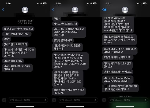 문자에는 ‘장사 그딴 식으로 하지 마’ ‘어디 쓰레기 음식을 가져다주고 니네가 먹는 거 내 앞에서 보여줬냐?’ ‘당장 환불해달라’ ‘X둥이가 마비 상태냐, 콧구멍이 막혔냐’ ‘도둑으로 몰리기 싫으면 집앞에 (새 음식) 당장 가져다 놓아라’ 등의 모욕적인 내용이 담겼다.