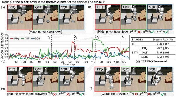 이에 최 교수 연구팀은 두 가지 핵심 아이디어를 제안했다. '상태 중요도 점수(State Importance Score, SIS)'로 로봇 제어 과정에서 임무 성공에 결정적인 상태를 자동 식별하고, '양자화-강건 행동 증류(Quantization-Robust Action Distillation, QRD)' 기법으로 중요한 상태에서 양자화 모델이 정밀 모델과 동일한 결정을 내리도록 했다.