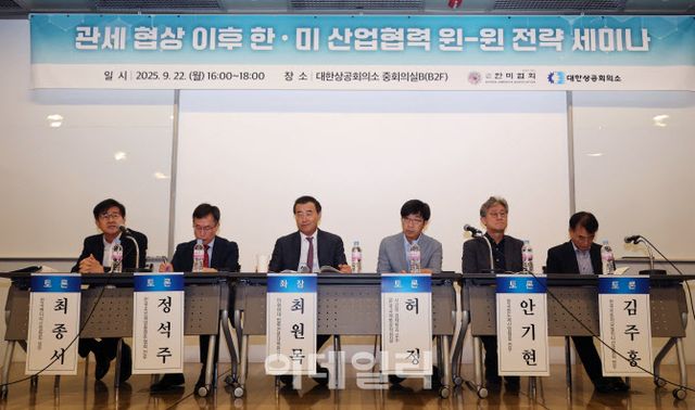 허정 서강대 경제학과 교수(한국국제통상학회장)는 22일 서울 중구 상의회관에서 대한상공회의소와 한미협회가 개최한 ‘관세 협상 이후 한미 산업협력 윈윈 전략 세미나’에서 이같이 강조했다. 미국의 벼랑 끝 압박으로 한미 간 관세 협상이 장기화 조짐을 보이고 있는 가운데 전문가들이 머리를 맞댄 자리에서다.
