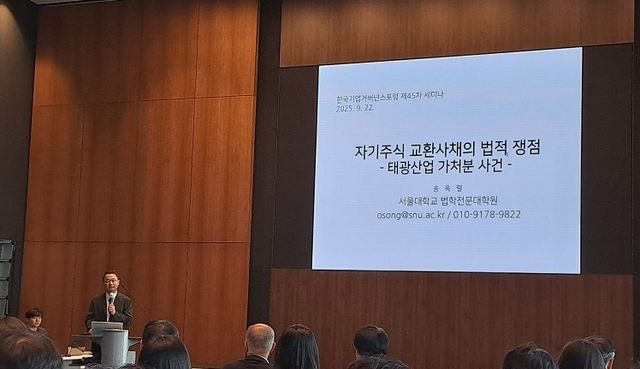 발제자로 나선 송옥렬 서울대 법학전문대학원 교수는 "(경영진이) 자기주식이라는 것을 회사가 현금화할 수 있는 귀중한 자산이라고 많이들 생각한다"고 지적했다.