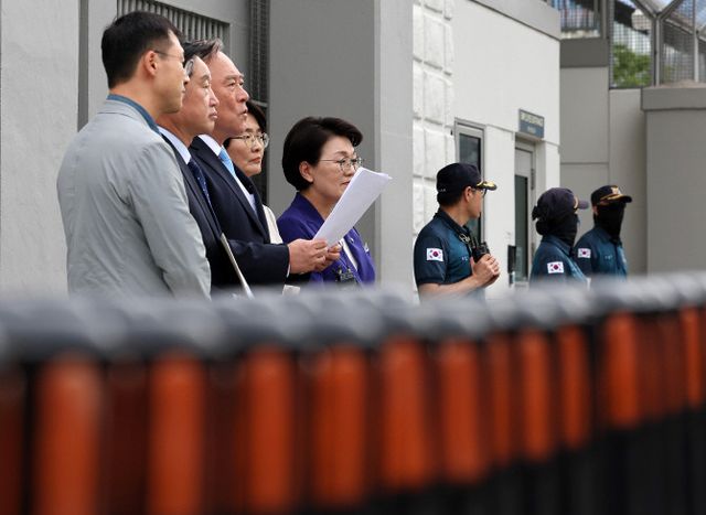 더불어민주당 초선 의원들이 22일 서울 종로구 주한미국대사관 앞에서 조지아 주 한인 구금 사태 해결과 한미 관세 협상 관련 입장을 발표하고 있다. 이날 면담은 김상욱, 김준혁, 이재강, 임미애, 권향엽 의원이 참석했다. ⓒ 연합뉴스