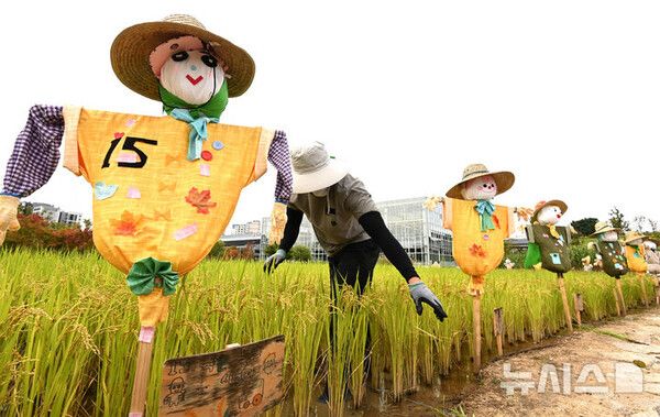 [서울=뉴시스] 절기상 추분을 하루 앞둔 22일 경기 수원시 국립농업박물관 다랑이 논에 세워진 허수아비가 익어가는 벼와 함께 정겨운 가을풍경을 연출하고 있다.