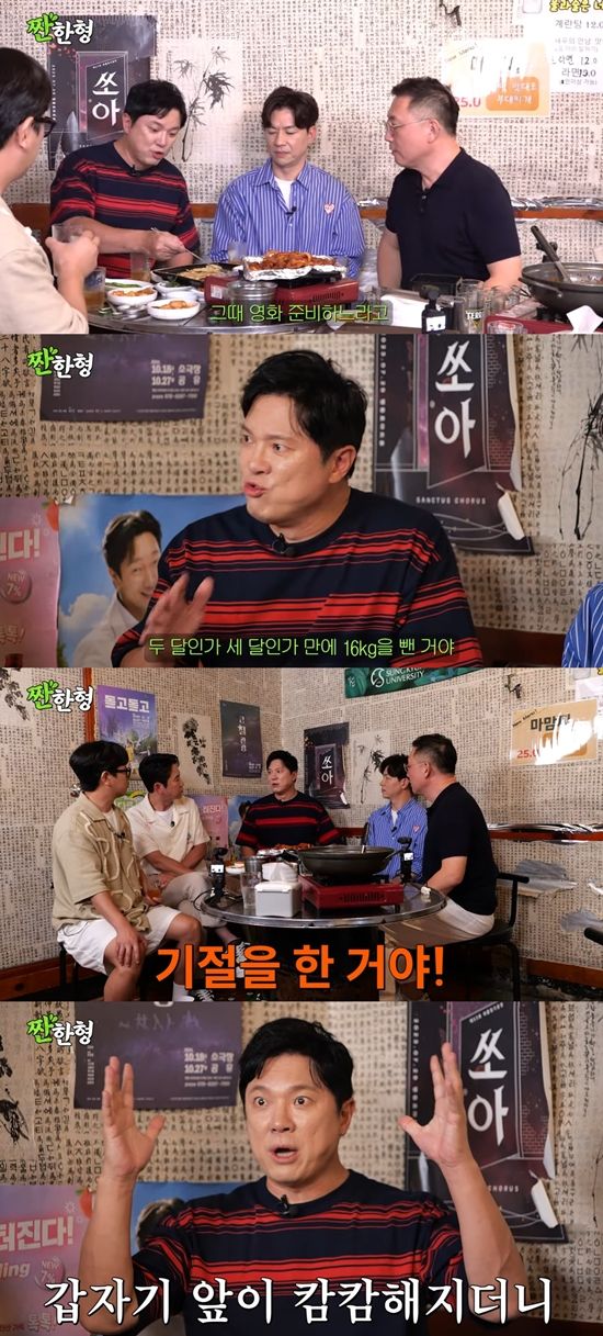 이날 정성화는 "'영웅' 때 내가 영화 준비하느라고 2~3달 안에 16kg을 뺐다. 그러다 보니까 사람이 저혈압 같은 게 오더라"라며 당시를 회상했다.