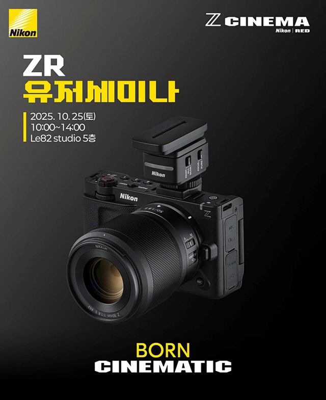 니콘이미징코리아가 Z CINEMA 시리즈 첫 모델 ZR 출시를 기념해 10월 25일 서울 Le82 studio에서 ‘ZR 유저세미나’를 개최한다고 밝혔다. 세미나는 총 50명을 모집하며, 참가자 전원에게 ZR 티셔츠와 쇼퍼백이 제공된다. 추첨을 통해 할인 쿠폰, ASUS 모니터, Sandisk 메모리 등 경품도 증정하며, 응모는 10월 12일까지 홈페이지에서 가능하다.