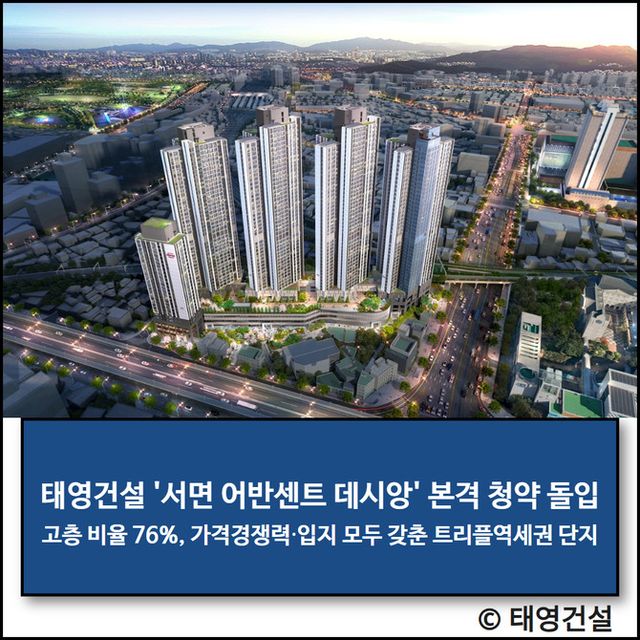 태영건설(009410)이 부산 부산진구 서면에 공급하는 '서면 어반센트 데시앙'이 22일 특별공급을 시작으로 본격 청약 일정에 돌입했다. 지난 12일 개관한 견본주택에 많은 내방객이 몰리며 높은 관심을 입증한 바 있다.