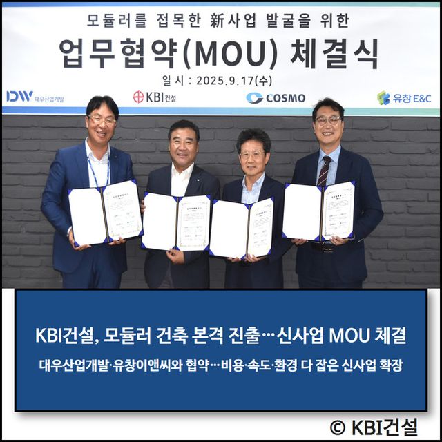 KBI건설이 모듈러 건축을 접목한 신사업에 본격 나선다. 지난 17일, KBI건설을 비롯한 △대우산업개발 △코스모이앤씨 △유창이앤씨는 '모듈러를 접목한 신사업 발굴을 위한 업무협약'을 체결하고 상호 협력체계를 강화했다.