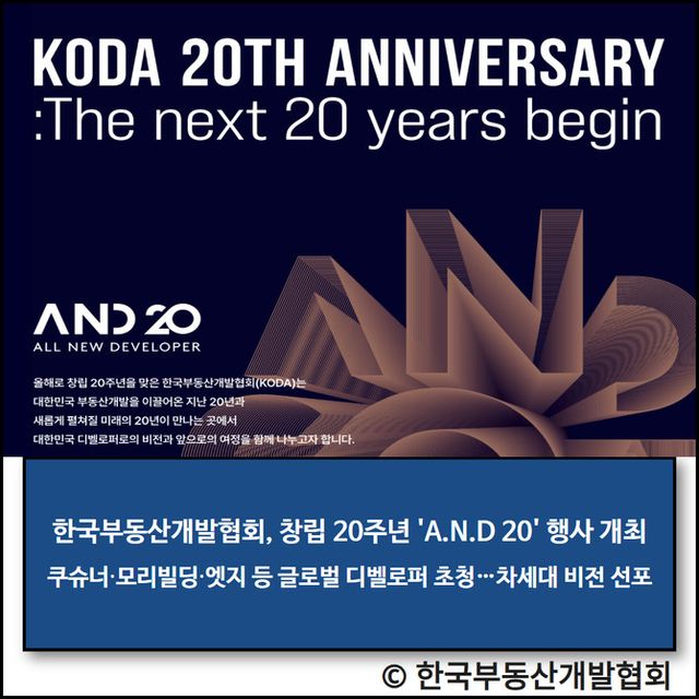 한국부동산개발협회(KODA)는 창립 20주년을 맞아 오는 11월20일 서울 파르나스에서 'A.N.D 20' 기념행사를 개최한다고 22일 밝혔다. 'ALL NEW DEVELOPER PROJECT'라는 슬로건 아래, 업계의 과거와 미래를 잇는 교차점을 조명할 예정이다.