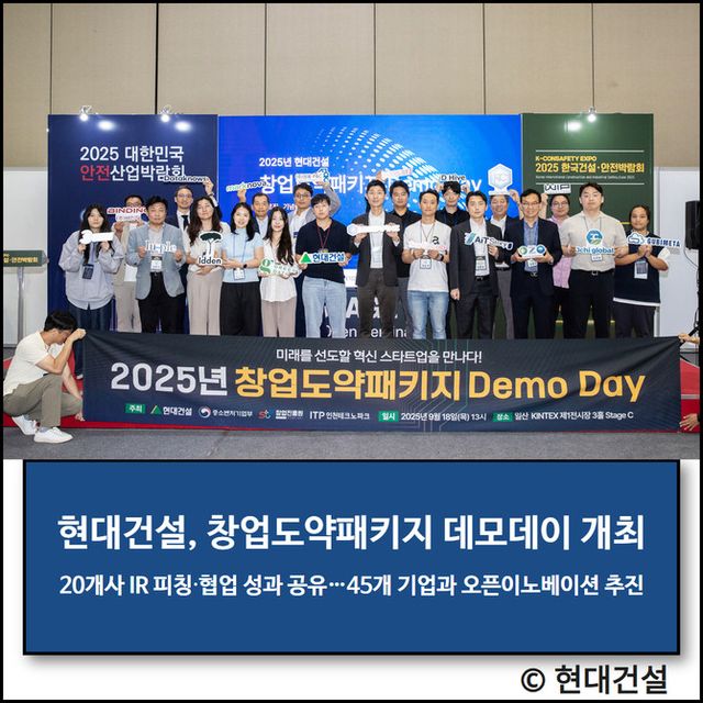 현대건설(000720)은 지난 18일 일산 킨텍스에서 '2025 한국건설·안전박람회'와 연계해 '2025 창업도약패키지 데모데이' 행사를 개최했다고 22일 밝혔다. 이 행사는 창업진흥원과 협력해 선발한 스타트업들의 기술 발표와 협업 성과를 공유하는 자리다.