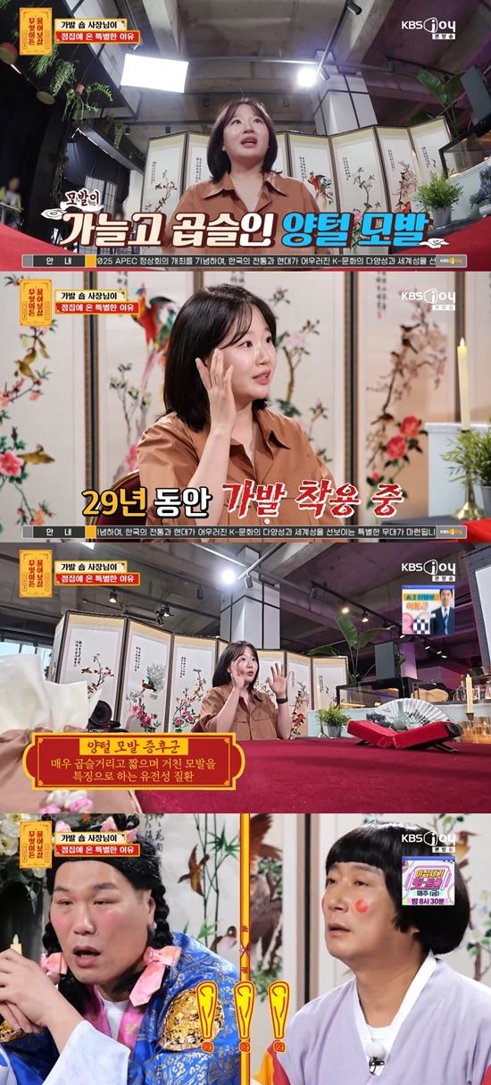이어 그는 "지금 아이는 7개월 됐다. 현재는 아기라 잘 모르겠다. 저보다는 (머리카락이) 많은 것 같다"라며 아이를 설명했다. 또 "저희 가족은 다 숱이 많고 저만 증상이 있다"라며 "엄마가 3살 때 병원에 데려가서 조직 검사를 해봤는데 이유를 모른다고 했다. 만 5살 때부터 가발을 썼다"라고 덧붙였다.