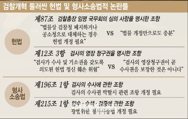 예를 들어 ‘수사’에 관한 사항을 나열한 형사소송법 제196조(검사의 수사) 1항에는 검사는 범죄의 혐의가 있다고 사료하는 때에는 범인, 범죄사실과 증거를 수사한다고 규정한다. 이는 검사의 수사권을 전제로 한 것인데 검사의 수사권이 박탈되면 관련 조항을 개정해야 한다. 또 215조(압수, 수색, 검증) 1항에 따르면 검사는 범죄수사에 필요한 때에는 피의자가 죄를 범했다고 의심할 만한 정황이 있고 해당 사건과 관계가 있다고 인정할 수 있는 것에 한정해 지방법원 판사에게 청구해 발부받은 영장에 의해 압수, 수색 또는 검증을 할 수 있다고 돼 있다. 이 역시 검사가 수사권을 갖고 있다는 것을 전제한 것으로 광범위한 형사사송법 개정이 필요하다.