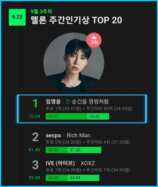 (엑스포츠뉴스 이정범 기자) 임영웅이 9월 3주 차 멜론 주간 인기상 1위에 올랐다.