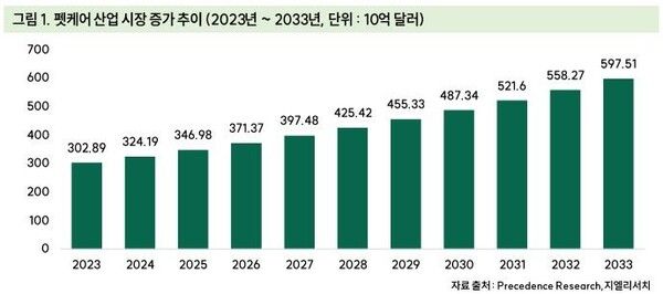 글로벌 펫케어 산업이 '펫코노미(Pet+Economy)'라는 신경제 영역으로 빠르게 확장되고 있다. 시장 규모는 지난해 약 3241억 달러에서 연평균 7% 성장해 2033년 5975억 달러에 이를 것으로 전망된다. 특히 프리미엄 제품과 반려묘 중심의 수요 확대가 성장을 주도하고 있다.