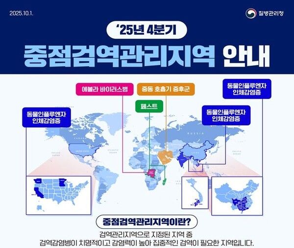 질병관리청은 해외감염병 발생 동향과 위험평가를 반영해 4분기 중점검역관리지역과 검역관리지역을 지정하고 10월 1일자로 시행한다고 23일 밝혔다.