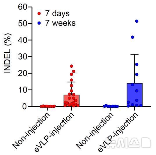 치료 후에 실시한 염기서열 분석에서는 높은 유전자 편집률을 기록했다. 기존 바이러스에 태웠을 때는 편집률이 0.6%에 그쳤지만 새로운 플랫폼으로는 최대 50%, 평균 14%로 23.5배 향상했다.