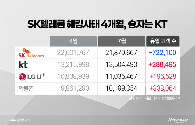 23일 과학기술정보통신부가 발표한 올해 7월 무선 통신서비스 통계 현황을 보면 SK텔레콤의 휴대폰 고객(회선) 수는 2187만9667명으로, 해킹 사실이 처음 알려진 4월(2260만1767명)보다 2.66%(72만2100명) 줄었다. 점유율도 40.08%에서 38.85%로 축소됐다. SK텔레콤 휴대폰 점유율이 40% 아래로 떨어진 건 이번이 처음이다.