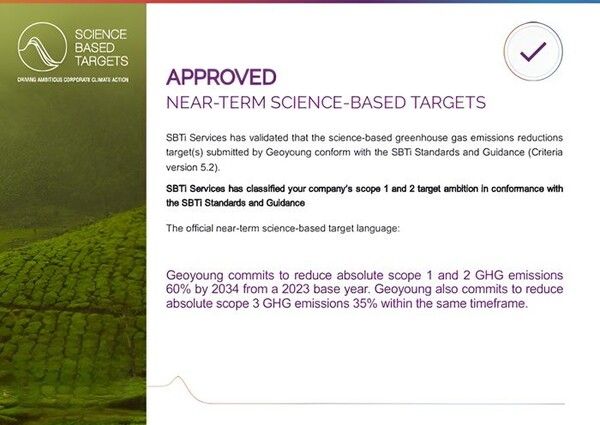 뉴시스 보도에 따르면, 지오영은 글로벌 기후변화 대응 이니셔티브 SBTi(Science Based Targets initiative)로부터 온실가스 감축 목표 승인을 획득했다고 23일 밝혔다.