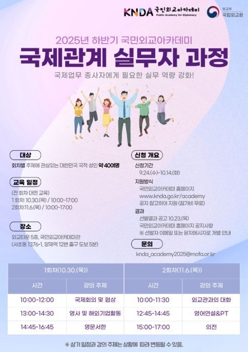 [와이뉴스] 외교부 국립외교원은 2025년 하반기 국민외교아카데미 국제관계 실무자 과정 참가자를 9월 24일부터 10월 14일까지 모집한다.