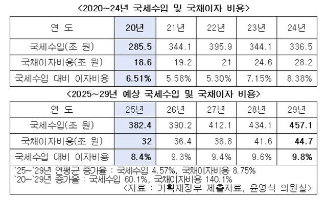 이에 따라 전체 국세 수입에서 이자 비용이 차지하는 비중도 2025년 8.4%에서 2029년 9.8%로 상승해 10%에 육박하게 된다.