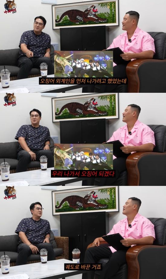 '오징어 외계인'을 작사하게 된 일에 대해서는 "사장님께서 미션을 주셨다. '이런 노래가 있는데, 너네가 글을 써와라' 하셨다"며 "그래서 추석 때 소파에 있는데 갑자기 KBS에서 '아기공룡 둘리'를 해주더라. 꼴뚜기 왕자가 지구에 떨어지더니 지구인들이랑 사고를 치지 않나. 그래서 아무 생각 없이 썼는데 채택이 됐다"면서 활동 당시 음악방송 3위까지 기록했다고 말했다.
