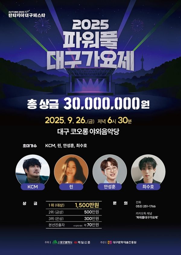 대구광역시는 오는 9월 26일(금) 오후 6시 30분, 코오롱 야외음악당에서 전국의 재능 있는 음악인들에게 무대의 기회를 제공하고, 시민과 함께하는 가요경연 축제인 ‘2025 파워풀 대구가요제’를 개최한다.
