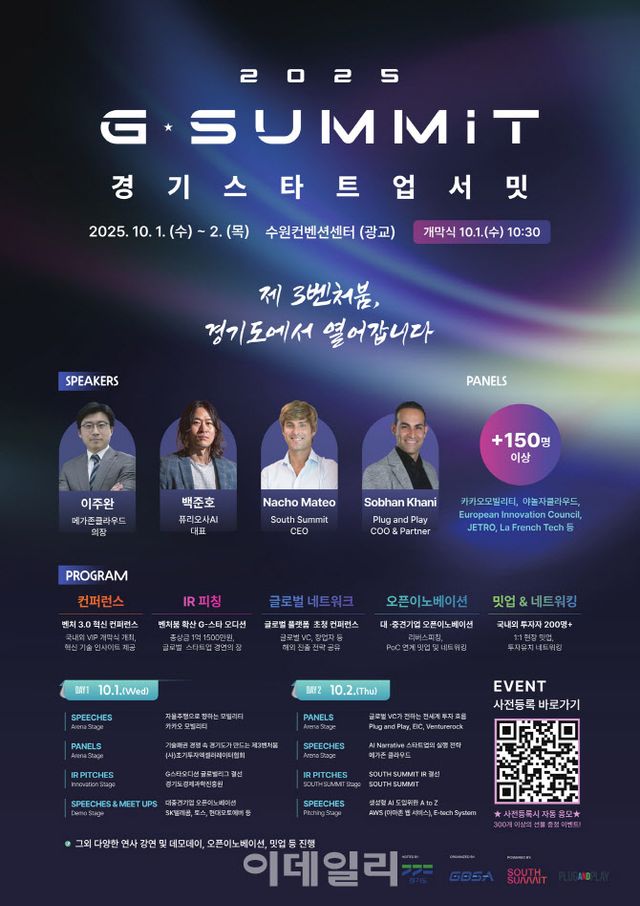 국내외 창업가·투자자·혁신기업 등 스타트업 생태계 관계자들이 모이는 ‘2025 경기 스타트업 서밋(G-SUMMIT)’은 누구나 무료로 참관 가능하며, 9월 30일까지 공식 홈페이지에서 사전 신청할 수 있다.